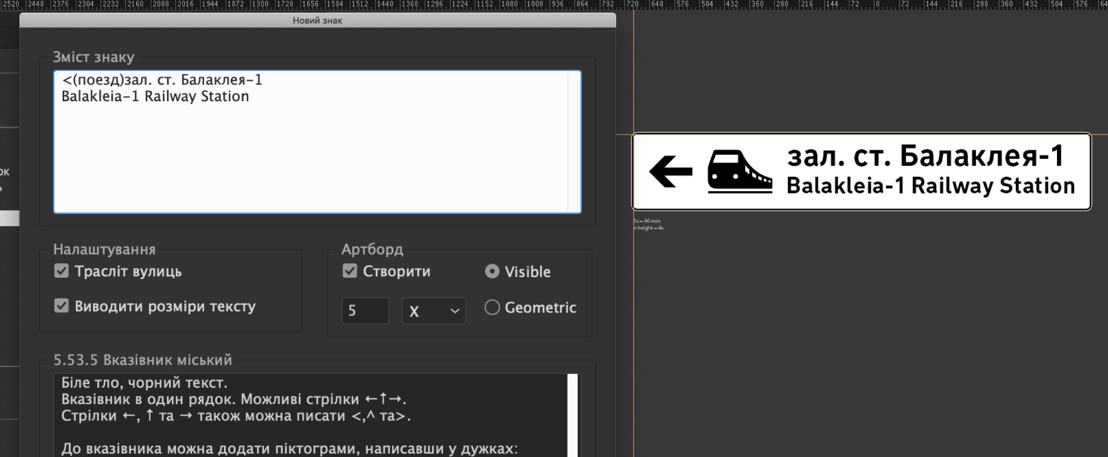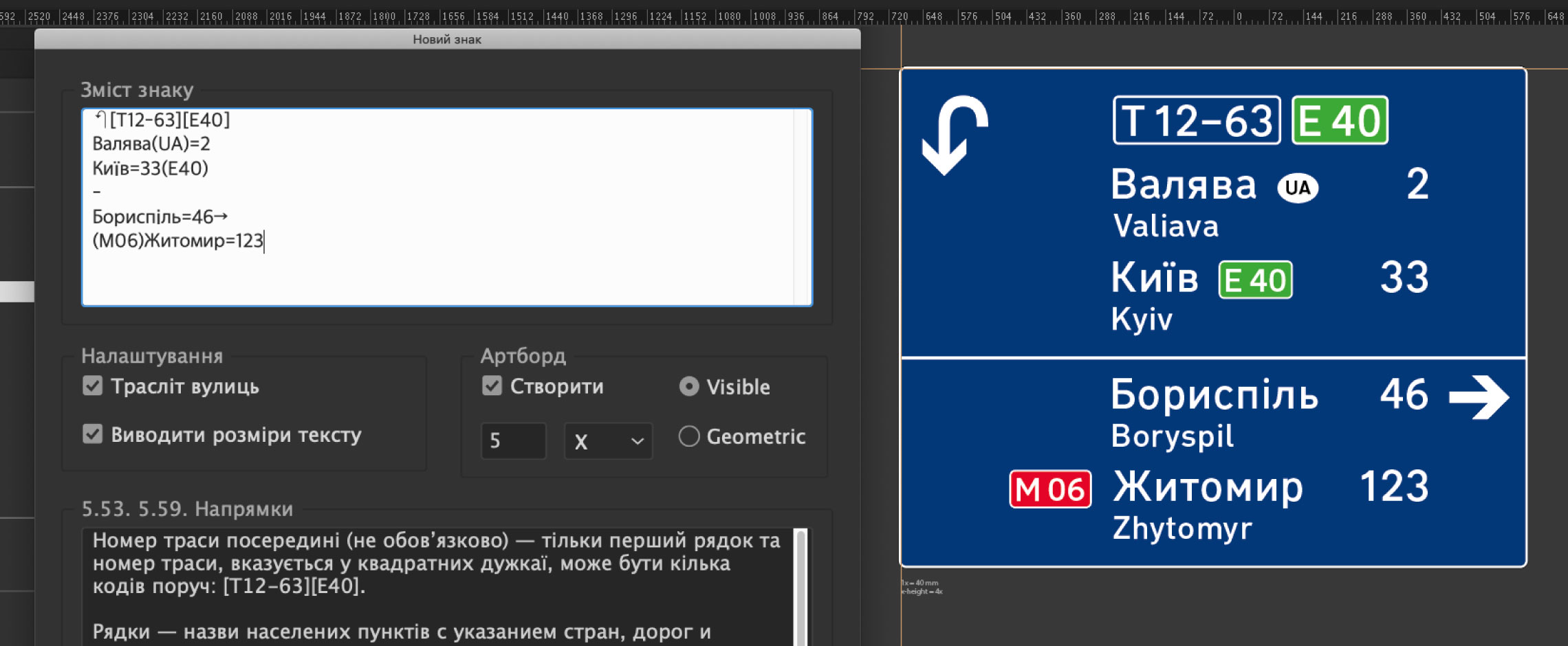 Here are examples of texts from simple to more complex, which turn into a ready-made road sign on a separate artboard with technical information (legend). The extension window also lists all the template's features: